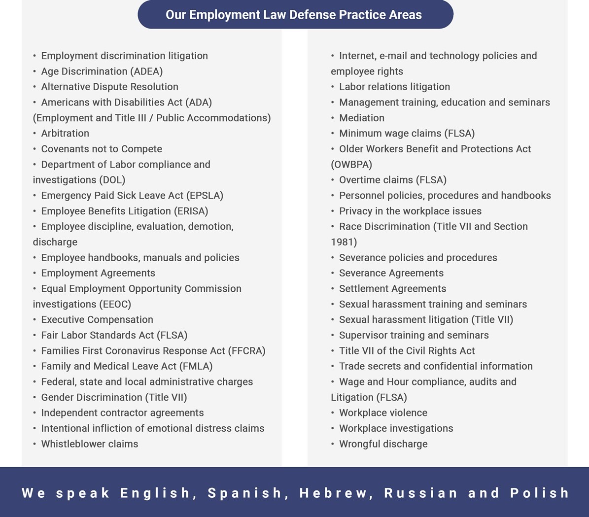 Our attorneys have extensive employment law and litigation experience, and advise clients in all areas of agency, state (Florida) and federal law, including:
